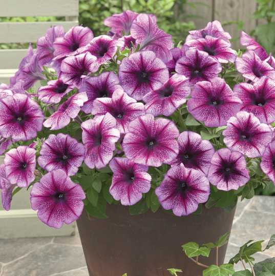 Petunia х hybrida Trilogy - серия гибридных полуампельных петуний каскадного типа! У растения очень короткие междоузлия и обильное цветение, весь сезон она выглядит как " шарик " усыпанный цветами. Плети не наращивает, остается компактной. В рассаде не требует прищипки, кустик сам выпускает боковые побеги. Компактный полусферический габитус,высотой 15-25 см, отличное ветвление, стелющиеся побеги с короткими междоузлиями - все это позволяет практически исключить дополнительное применение регуляторов роста при производстве. Цветы яркие, на солнце не выгорают! Устойчива к дождю.