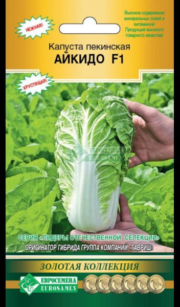 Пекинская капуста – неприхотливая овощная культура семейства Капустные, которая может давать два урожая за сезон, вырастить ее сможет даже неопытный дачник. Это популярное растение в кухнях многих народов, за ним легко ухаживать. Она абсолютно не капризная, растет быстро, отлично хранится, очень полезна и имеет великолепные вкусовые качества. Благодаря низкой калорийности, пекинская капуста прочно занимает ведущие строчки в диетических меню. Из хрустящих сочных листьев с нежным и неярким вкусом делают преимущественно салаты. «Айкидо F1»- среднеспелый гибрид пекинской капусты. Период от всходов до получения готовой продукции 65-70 дней. Розетка листьев полу прямостоячая. Кочаны, массой 2 кг, яйцевидной формы, средней плотности, полуоткрытые, на разрезе - желтые. Лист среднего размера, обратнояйцевидный, зеленый, пузырчатый, слабоопушенный. Жилка листа вогнутая, у основания - средней ширины, белая. Рекомендуется для использования в свежем виде и краткосрочного хранения. Продукция высокого товарного качества.
