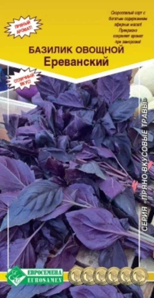 «Ереванский»- скороспелый сорт с богатым содержанием эфирных масел, имеет приятный запах душистого перца и чая, в свежем виде является ценным источником каротина и рутина. Благодаря своей неприхотливости и окрасу листьев смотрится очень декоративно. Растение 40-60 см высотой, массой 300 грамм, великолепно отрастает после срезки. Свежие и высушенные листья хороши в качестве приправы к рыбным и мясным блюдам, соусам, салатам. Прекрасно сохраняет аромат при заморозке.
