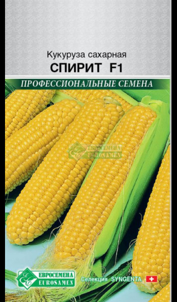 Сахарная кукуруза — одна из самых популярных у российских дачников огородных культур. Обладая сладким привкусом, отварные початки сахарной кукурузы любимы как взрослыми, так и детьми. Помимо приятного вкуса и высокой сытности, продукт содержит ряд витаминов и микроэлементов, а также огромный запас клетчатки. Кукуруза сахарная — полезный и высокопитательный продукт, вырастить который сможет любой начинающий садовод. Спирит F1- раннеспелый гибрид кукурузы сахарной, в российских условиях сорт показал себя как один из лучших во всех регионах возделывания культуры. Дружно созревающий гибрид с высокой товарностью початков, от посева до технической спелости 67-75 дней. Растения выровненные, высотой 140-165 см. Первый початок закладывается на высоте 50 см. Початок цилиндрической формы, длиной 20 см, диаметром 4,5-5 см, с 14-16 рядами зёрен светло-жёлтой окраски, массой 190 г. Рекомендуется для использования в варёном виде, для замораживания и консервирования. Урожайность кондиционных початков 7-9 кг/м2.
