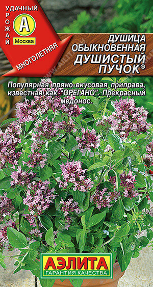 Душица (орегано) – ароматный лекарственный многолетник, отличный медонос. Растения формируют хорошо облиственные кустики высотой 25-30 см, диаметром 45-50 см. Свежая и сушеная зелень дущицы используется в кулинарии в качестве пряно-вкусовой приправы и для приготовления чая. Уборку урожая проводят во время цветения, начиная со второго года вегетации. Растения срезают на высоте 15-20 см от поверхности почвы. В фазе 4-5 пар настоящих листьев сеянцы пикируют. На одном месте выращивают не более 4-5 лет с ограничением разрастания.