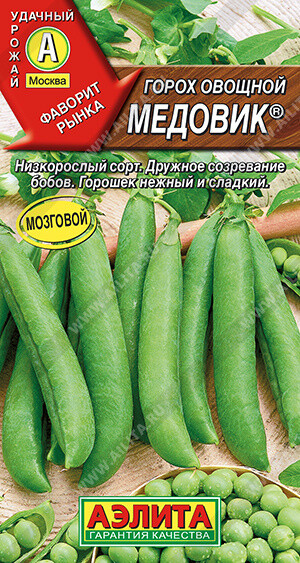 Очень популярный среднеспелый лущильный сорт. Относится к мозговым сортам, которые дают самый сладкий горошек высшего качества. В биологической спелости семена морщинистые. Лакомиться горошком можно на 60-70 день после всходов. Стебель длиной 40-60 см. Бобы длинные, широкие. Вкусовые качества отличные. Созревание бобов дружное. Рекомендуется для использования в свежем виде, кулинарии и для консервирования. Урожайность зеленого горошка: 0,5-0,6 кг/м2.